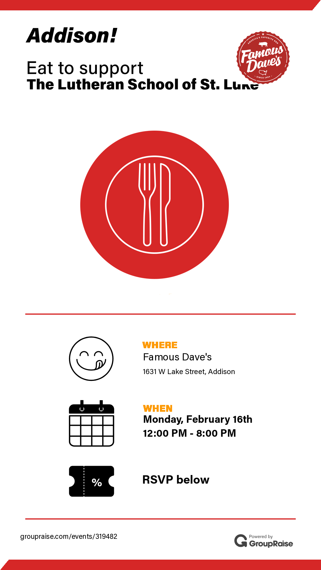 February’s PTL Forks for Funds is at Famous Dave! Join us on Monday, February 16th at Famous Dave’s in Addison (Online Order or Dine-in) from 12 - 8 pm. Enjoy a delicious meal at the restaurant or at home, spend time with your Saint Luke friends and family while supporting our school. 20% of all purchases comes back to our school ministry. Click hereto show flyer in restaurant (Hard copy or mobile version). Hope to see you there!